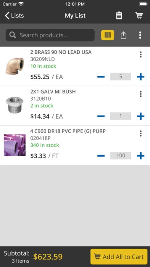 Easily place orders and restock inventory. Simply scan a product bar code or QR code and add a quantity. Build your list of part numbers and either export for offline use or order online with your Online Advantage account.
