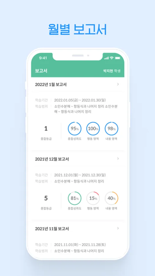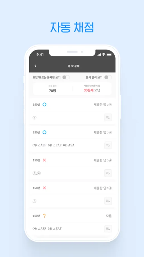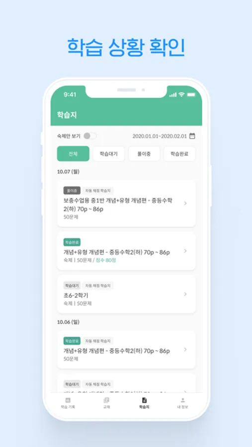 학생도 자신의 학습 기록을 확인하고, 교재와 학습지를 직접 채점해 점수를 확인할 수 있습니다.