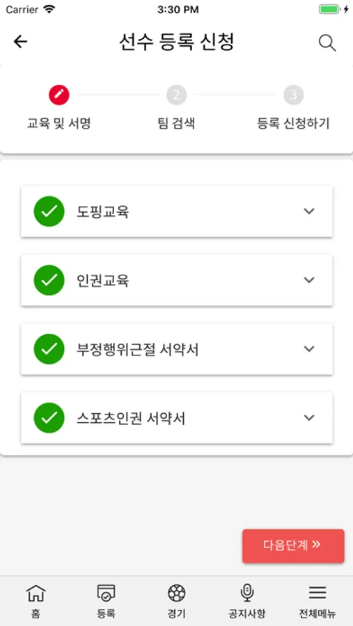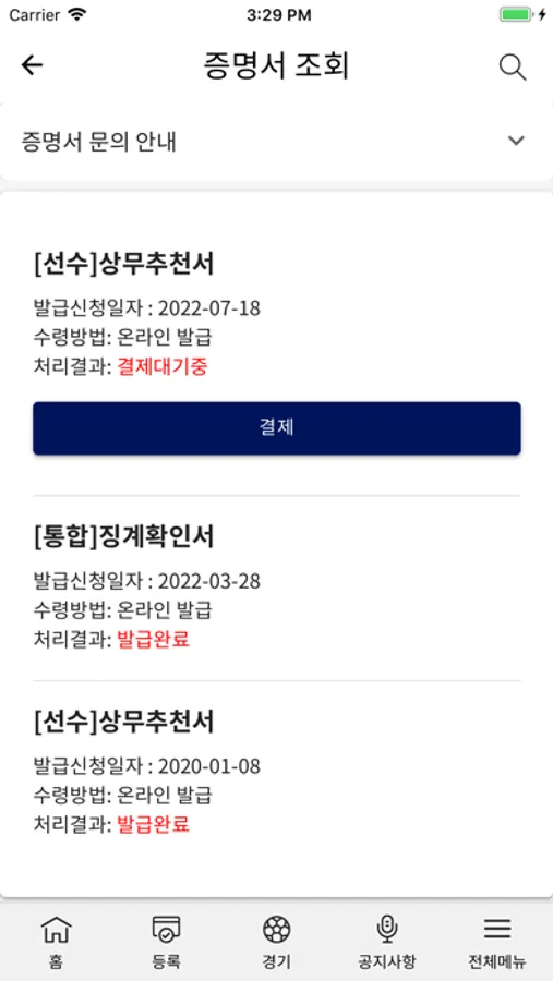 또한, 심판, 지도자, 선수등록 관련 업무도 ‘조인KFA 앱’에서 가능하다. 이적신청과 승인이 모바일로 처리되며, 등록비 납부도 된다. 지금껏 직접 방문해야 받을 수 있었던 실적증명서와 경력증명서도 앱에서 신청, 결제, 발급까지 한 번에 처리 할 수 있다.