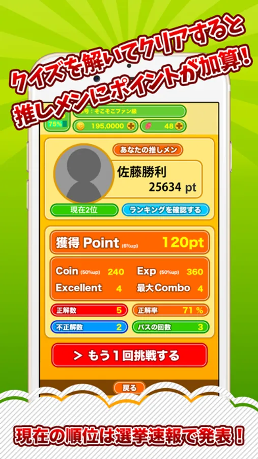 クイズを10問解くと推しメンにポイントが加算されます。(全問正解でポイント2倍!)
