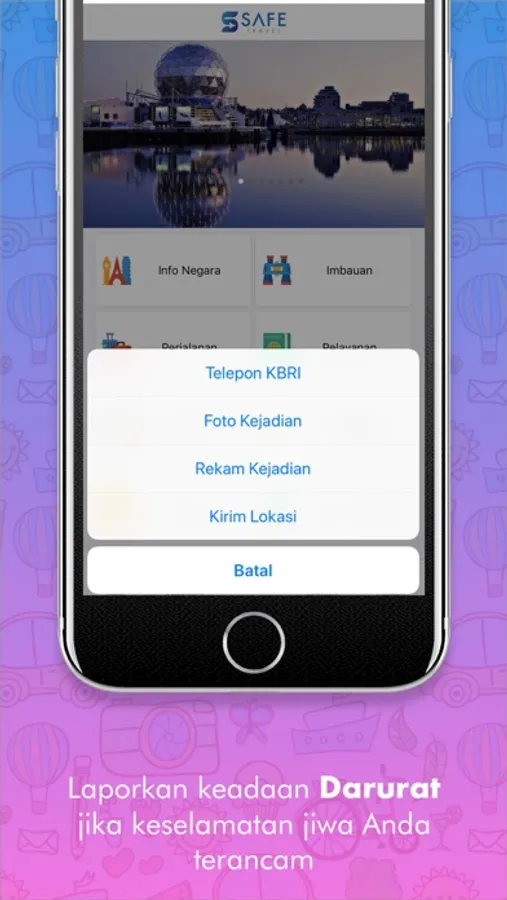Safe Travel memiliki fitur DARURAT yang dapat digunakan untuk meminta pertolongan cepat dalam kondisi yang mebahayakan jiwa anda. Anda dapat mengirimkan lokasi, merekam video dan menelpon KBRI/KJRI/KRI terdekat dan melaporkan kejadian yang Anda alami.