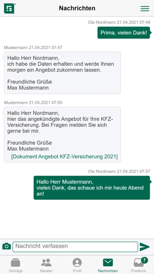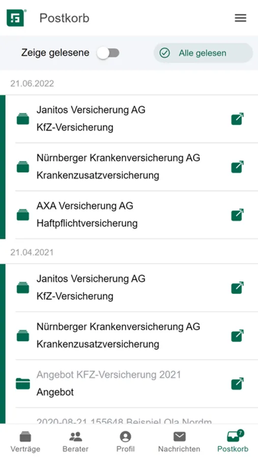 • Im Postkorb werden alle neuen Informationen übersichtlich zur Verfügung gestellt. Die Informationen umfassen Verträge, Dokumente, Schäden und alle relevanten Nachrichten.