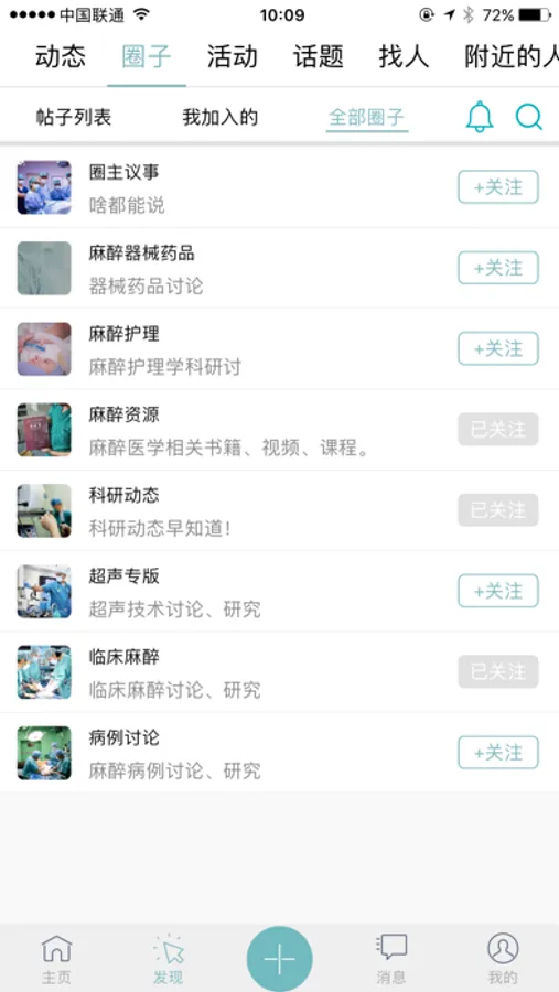 主要模块:临床麻醉、兴趣圈子、朋友动态、文章投稿、医学研讨、案例分享、活动报名、话题讨论、即时通讯、医师认证。