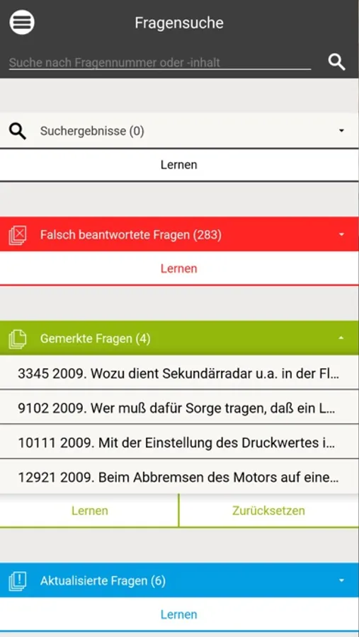 • Einzelne Fragen kannst du markieren und dann separat lernen