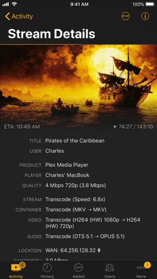 - List of current streams incl. details like user, player, quality, eta
