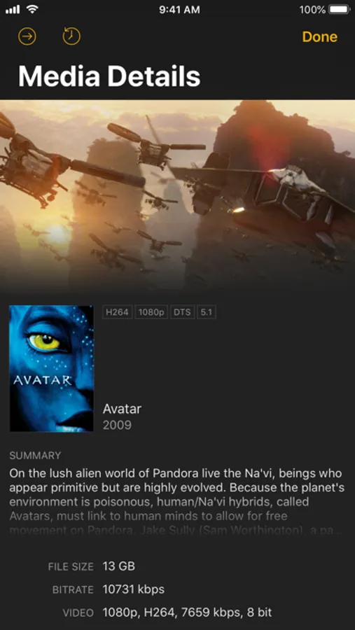- All details to media e.g. summary, file size, bitrate, audio/video/subtitle tracks, duration, release date, rating, related media and more