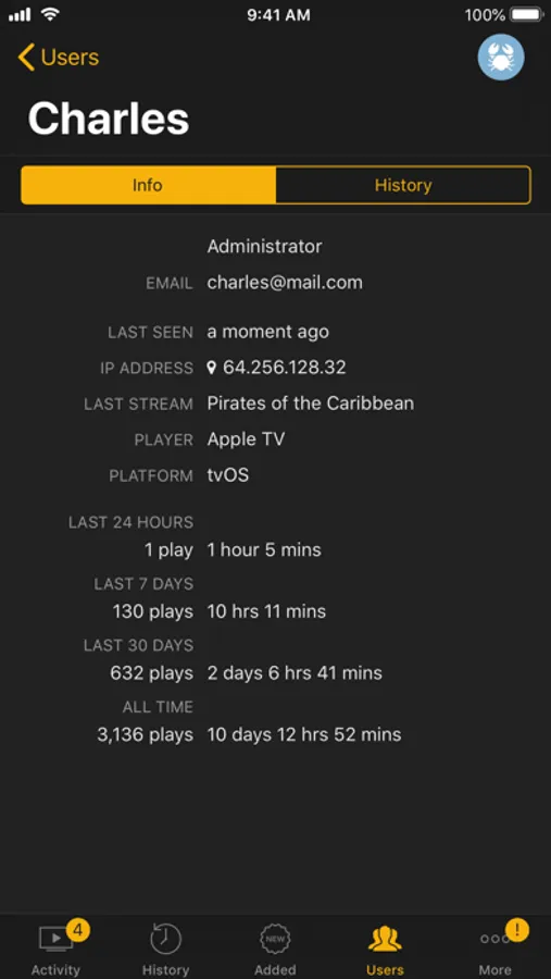 - User list incl. details like playback statistics, recently watched, last known ip address incl. map*, and user's playback history