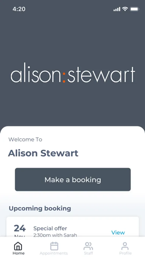 The Alison Stewart app makes booking your appointments and managing your loyalty points even easier. You're just a few taps away from feeling good and looking great!