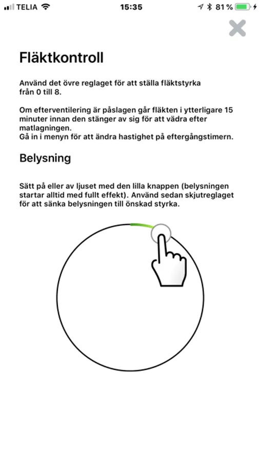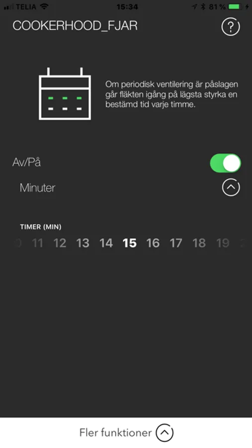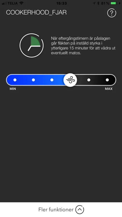 Styr Fjäråskupans avancerade köksfläktar med din mobiltelefon! Välj fläktstyrka, ljusstyrka, eftergångsfläktning och tid för periodisk ventilering.