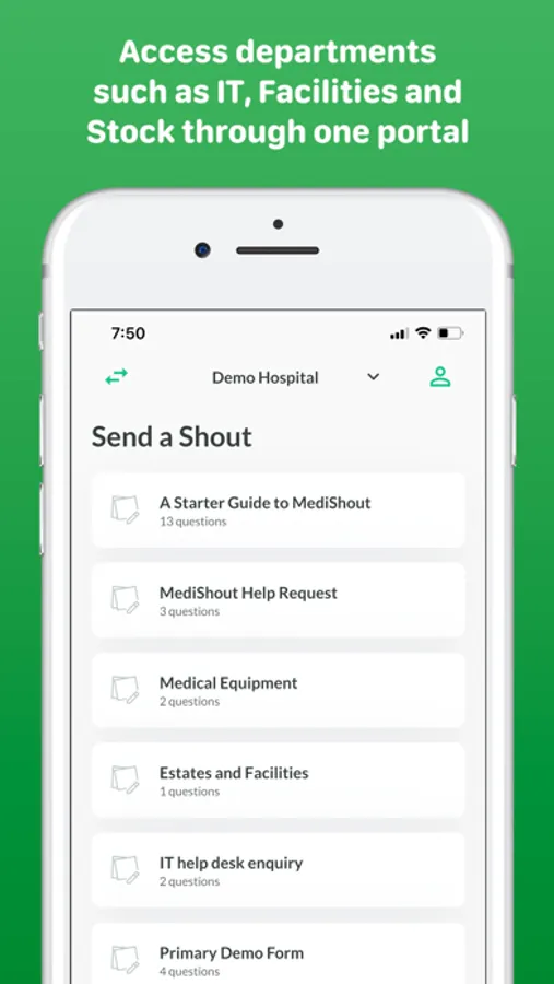 Users of the MediShout app simply select their ward, type their problem, add a photo and press send. They can be messaged back on the app for more information or notified when the issue is resolved. Our platform allows staff to instantly access departments such as IT, Facilities and Stock through one portal.