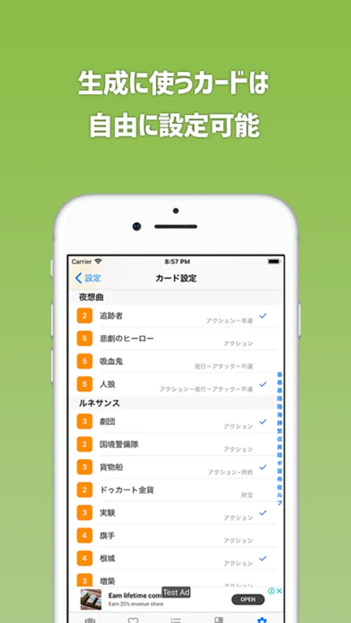 イベントカードは選出の有無や枚数の設定、特殊なランダマイザー(山札の上下でカードの種類が異なる、等)にも対応しています。
