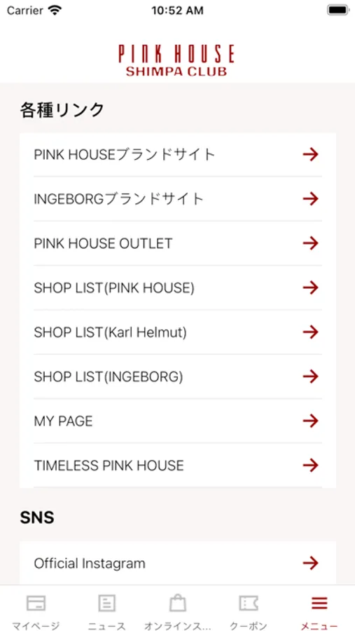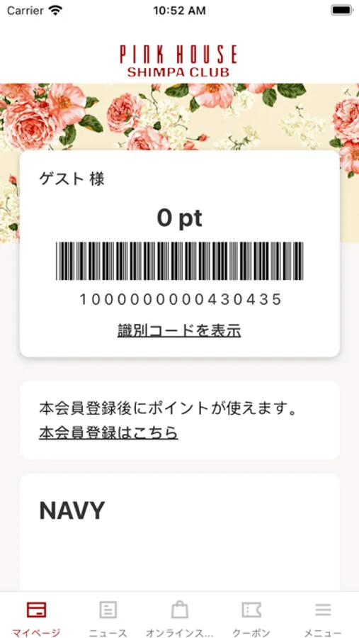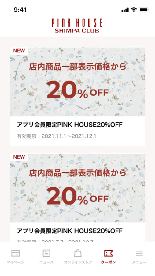 PINKHOUSE SHIMPACLUBアプリでアカウント登録すると店舗でのお買い上げ時にご提示いただくメンバーズカードとして、とても便利にご利用いただけます。