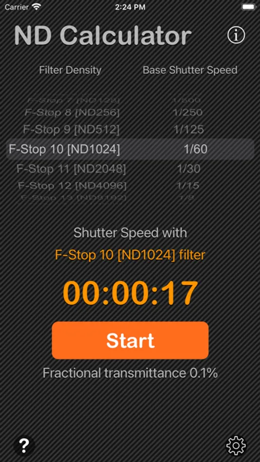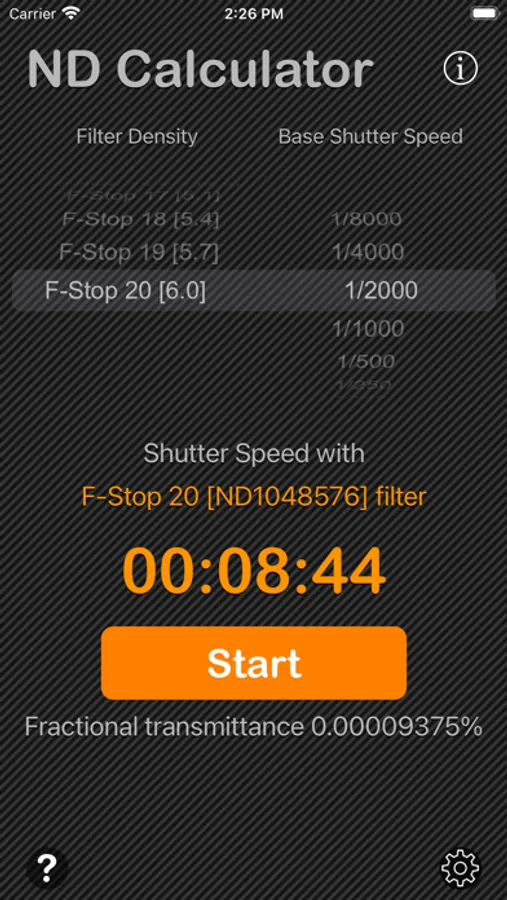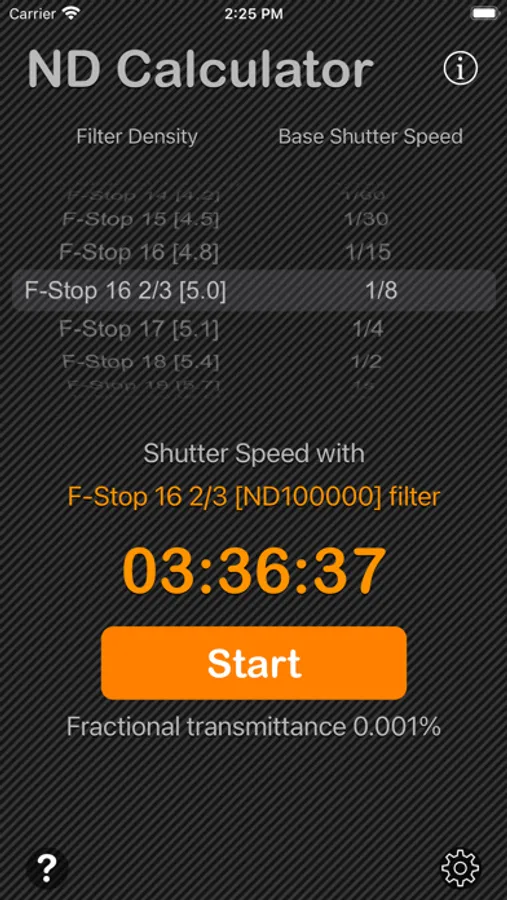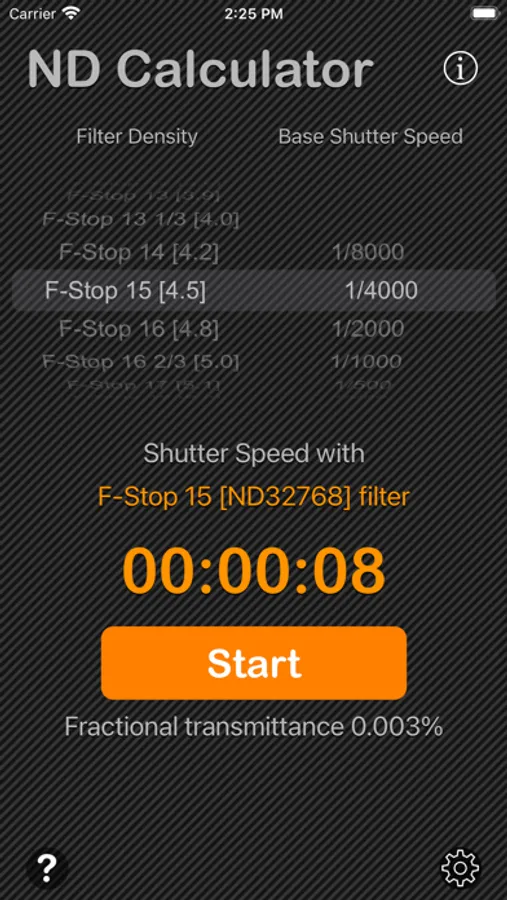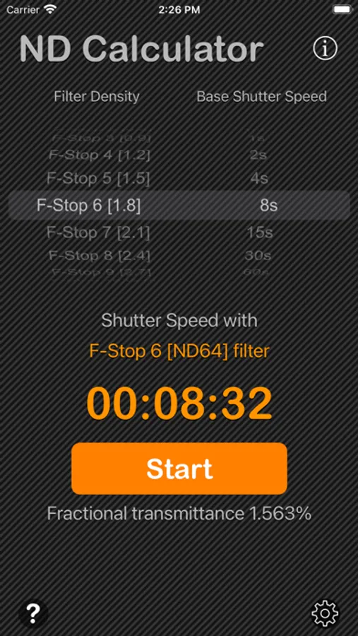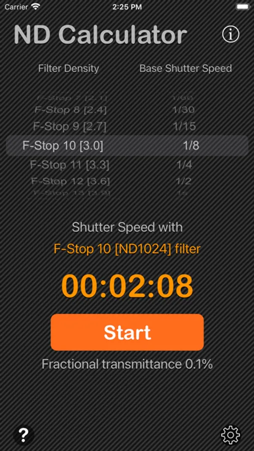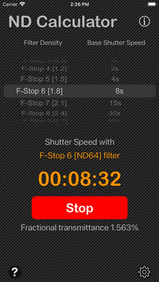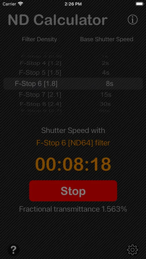 Neutral Density Calculator for photographers to calculate the shutter speed when adding neutral density filters to your lens. Set the filter you are using and the shutter speed without the filter and the app calculates the new shutter speed with your filter fitted. This is a utility app that helps you determine the correct exposure time/shutter speed when using Neutral Density Filters.