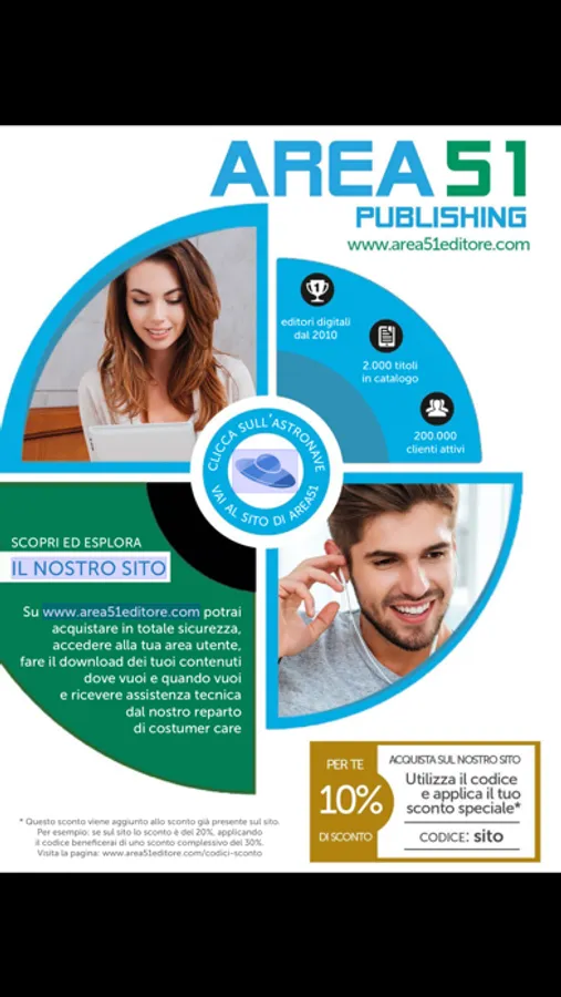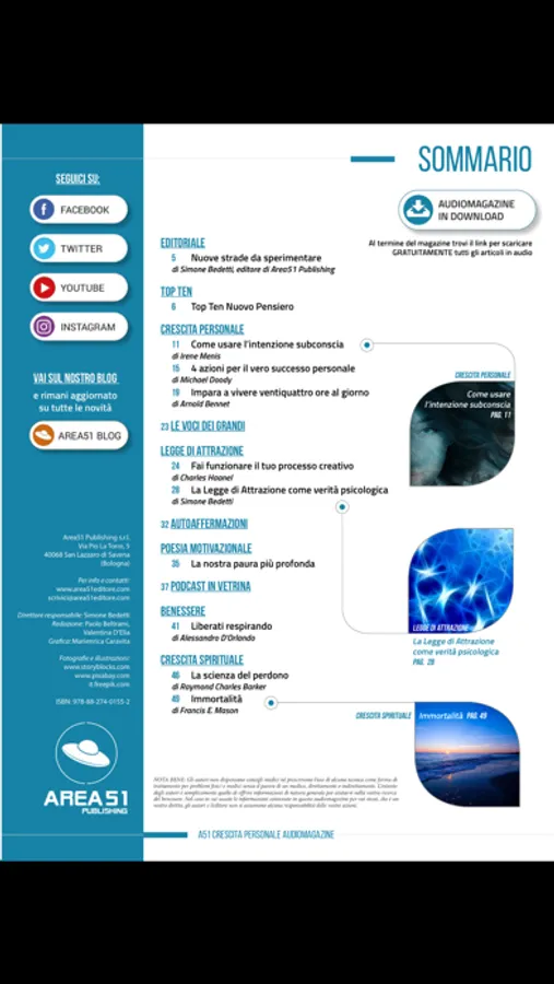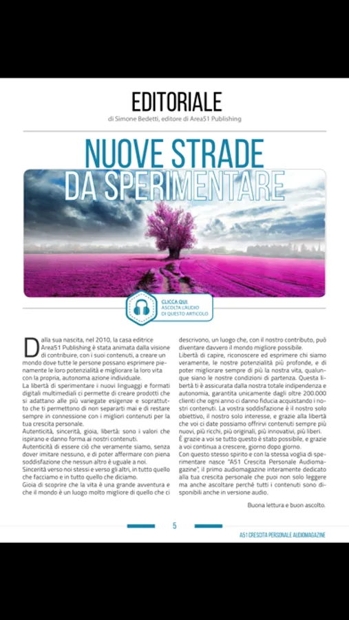Il primo audiomagazine dedicato alla tua crescita personale. A51 Crescita personale Audiomagazine è il magazine che puoi leggere ascoltare per conoscere, approfondire e mettere in pratica i migliori contenuti per la tua crescita personale. Nasce dall'esperienza di Area51 Publishing, la casa editrice con il più ampio catalogo di contenuti audio per la crescita personale in lingua italiana. Ogni rubrica, ogni articolo e ogni approfondimento del magazine sono anche in audio affinché tu possa portare sempre con te, in piena libertà, i migliori contenuti per la tua crescita personale. Autenticità, sincerità, gioia e libertà sono i valori che ispirano e danno forma ai contenuti di A51 Crescita personale audiomagazine, contenuti sempre più nuovi, più ricchi, più originali, più innovativi, più liberi per la tua crescita personale, il tuo benessere mentale ed emozionale e la tua evoluzione spirituale. Perché leggere ascoltare questo audiomagazine . Per avere un ulteriore strumento per conoscere, approfondire e mettere in pratica i migliori contenuti per la tua crescita personale . Per portare sempre con te parole, consigli, voci dei grandi maestri della crescita personale . Per avere un’innovativa opportunità per sperimentare e avanzare nella tua crescita personale, la tua motivazione, il tuo benessere e la tua evoluzione spirituale A chi si rivolge l’audiomagazine . A chi desidera avere un ulteriore strumento pratico e immediato per migliorare la propria vita ed esprimere al meglio la propria unicità . A chi vuole approfondire e aggiornarsi sui temi della crescita personale, la motivazione, la Legge di Attrazione, il benessere e la crescita spirituale . Agli educatori, professionisti, psicologi, coach, operatori del benessere che vogliono approfondire e aggiornarsi con i migliori contenuti di crescita personale