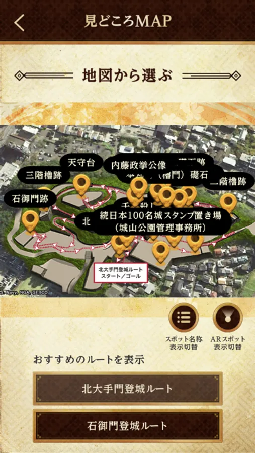延岡城の見どころとオススメルートが確認できます。見どころについては写真付で解説されています。