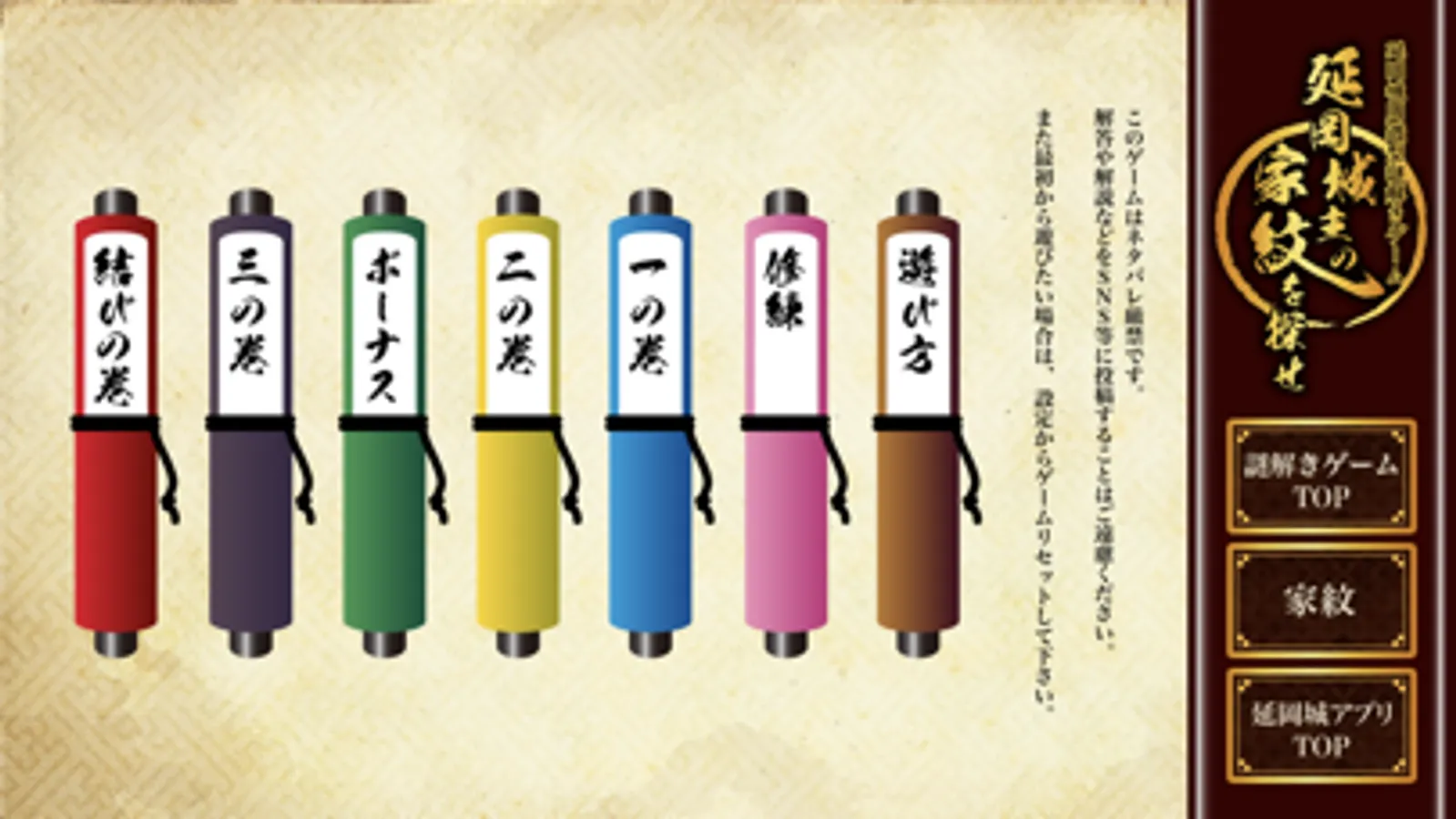 「謎」に答えながら延岡城を散策できるゲームです。あなたは全問クリアして歴代城主の5つの家紋をゲットできるのか?