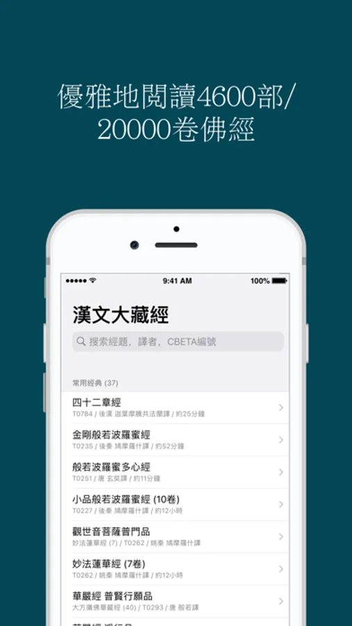 中華電子佛典協會(Chinese Buddhist Electronic Text Association 簡稱 CBETA)於1998成立,是總部設在台灣的非營利性組織,旨在完成漢文佛典的數位化工作。本 App 中的佛經,是與 CBETA 的最新數據同步的。主要來自「大正新脩大藏經」「卍新纂大日本續藏經」,選錄和補錄的部分也有「嘉興藏」「高麗藏」「乾隆藏」「趙城金藏」「永樂北藏」「中華大藏經」「國家圖書館善本佛典」「藏外佛教文獻 」「北朝佛教石刻拓片百品」「房山石經」「洪武南藏」「漢譯南傳大藏經」「中國佛寺史志彙刊 」「印順法師佛學著作集」「呂澂佛學著作集」等等。