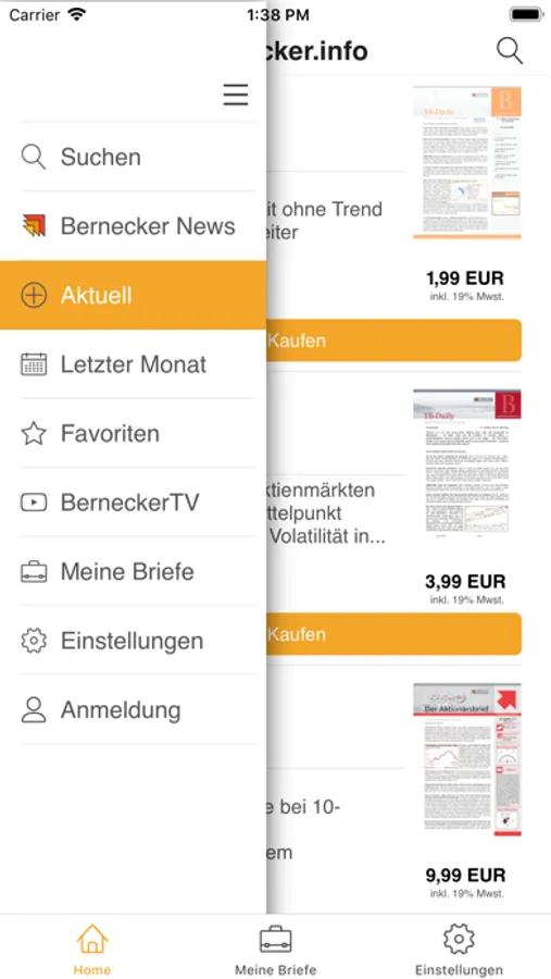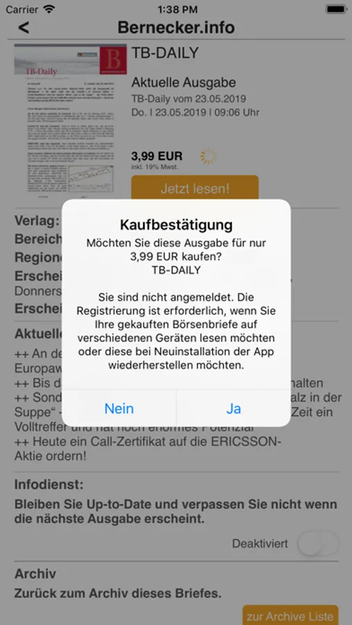 - Man kann sich ein Konto anlegen über Menü >> Anmeldung: So kann man seinen einmal gekauften Brief auf verschiedenen Endgeräten lesen.