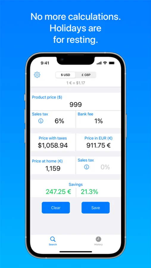 No more calculations. PriceConvert will perform them for you. Holidays are for resting.