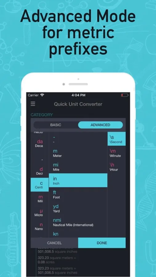 Plus an advanced view which makes available Scientific prefixes like Exa, Peta, Tera, Giga, Mega, Kilo, Deci, Centi, Milli, Micro, Nano, Pico, etc. Allowing you to make more scientific calculations.