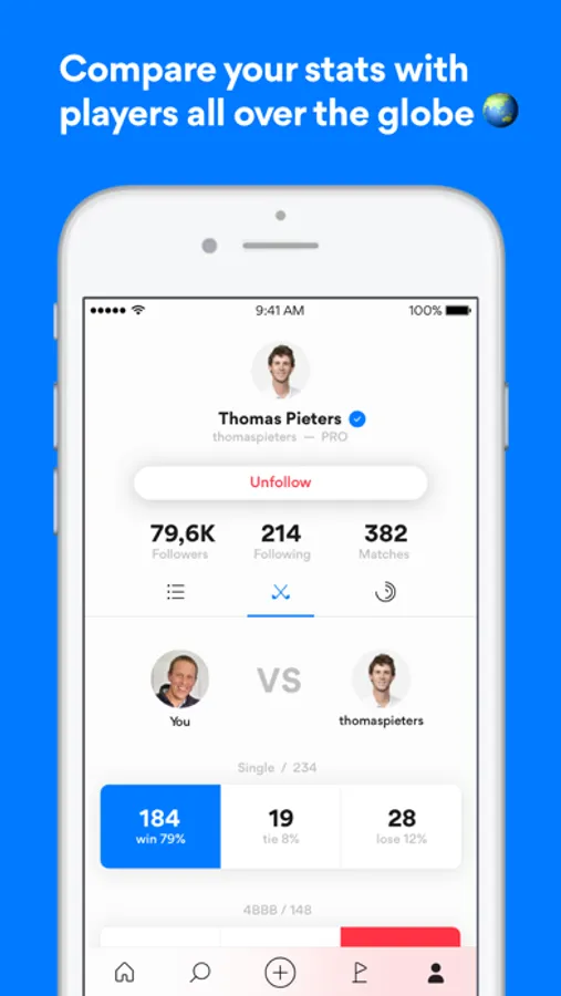 Follow your favourite golf players, pro’s and friends. Never miss any of their success anymore! You can even compare you stats with other (pro)players worldwide. Welcome to the world of match play!