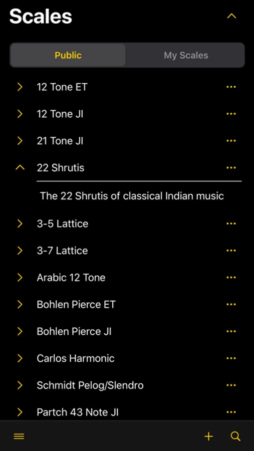 Each scale can be selected, and its notes can be played to get a feel for it before tuning your instrument.