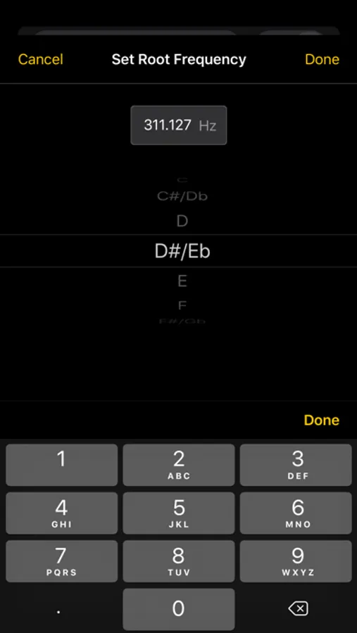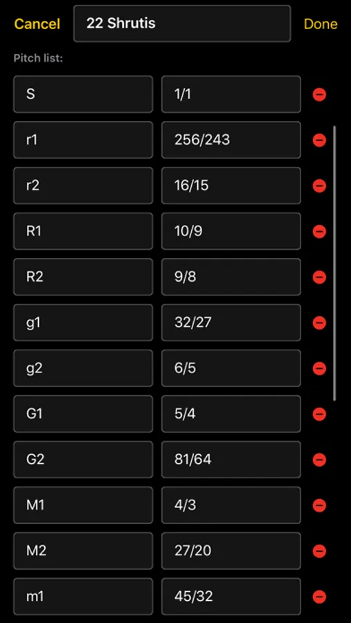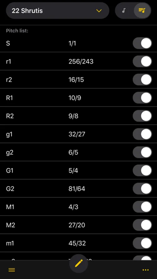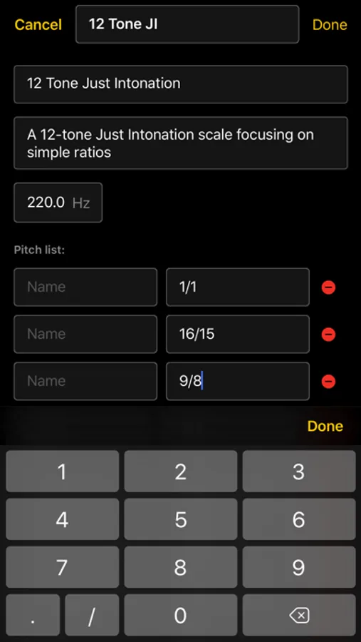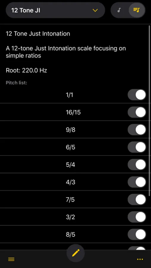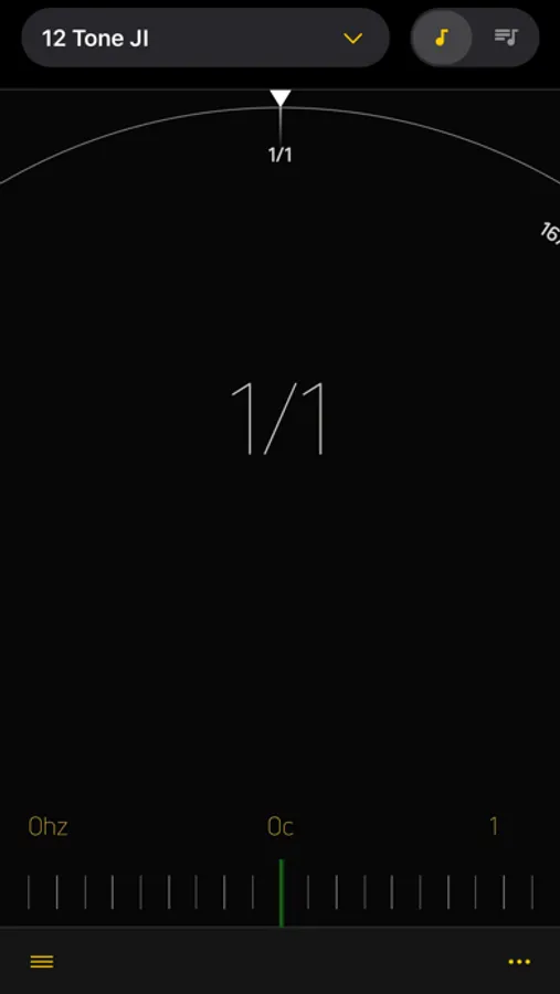 Each scale may have a different root note (1/1), and the root note frequency (1/1) can be adjusted while tuning.