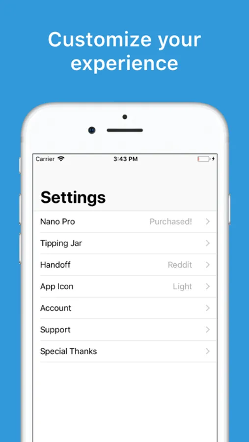 Note: Some features displayed in the screenshots are part of an optional paid pro upgrade. These include favorites, multireddits, more than 5 subscriptions, and Handoff support.