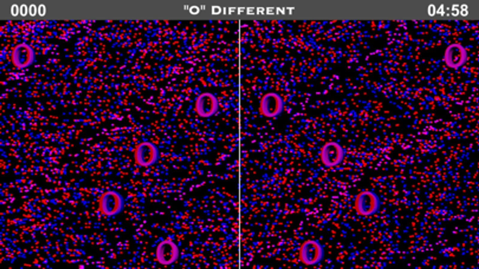 2. A total of ten stereoscopic "O" letters in screen. Five stereoscopic "O" letters on the left half of screen. Five stereoscopic "O" letters on the right half of screen.
