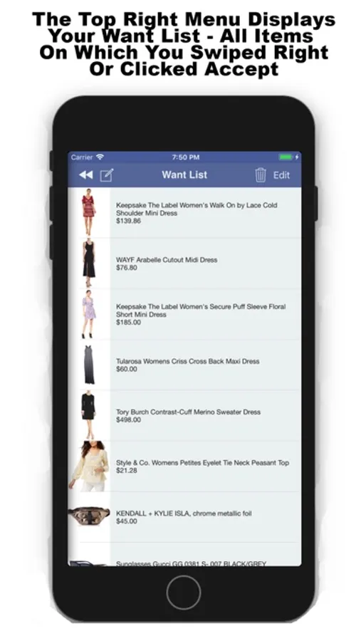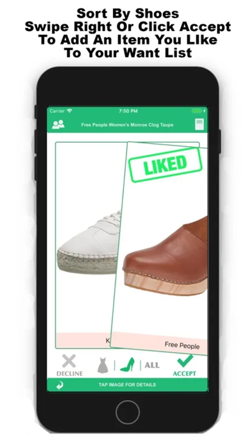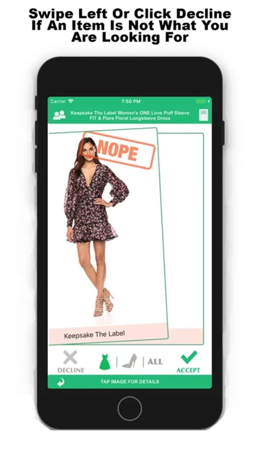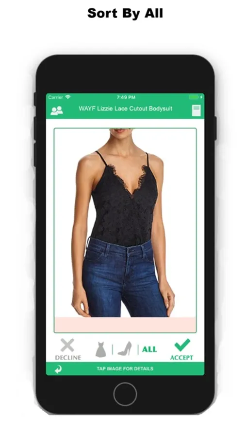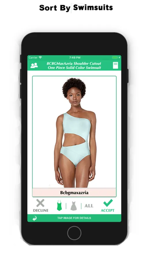 While viewing thousands of fashion items - sortable by buttons available on bottom middle of screen - Swimsuits, Dresses, and ALL - swipe right or click Accept to add an item to your Online Shopping List. Swipe left or click Decline for items that don’t match your style.