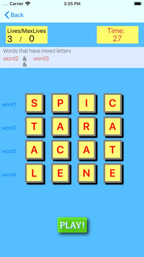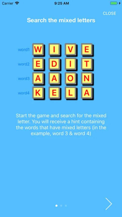 From the original 4x4 square, which contains real horizontal and vertical words, at the beginning of the game there is a square containing pairs of words that have changed a letter between them. To find the original words, drag the letter from the first word over the corresponding letter in the second word and they change their place. If the correct word is reached, it becomes green. You will get a hint containing the words that have mixed letters