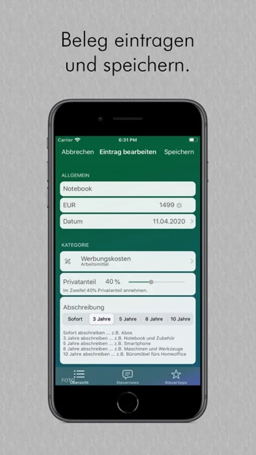 - Digitale Verwaltung aller Belege für die Arbeitnehmerveranlagung: du sammelst bequem mit deinem Smartphone während des Jahres die Belege, die du für die Steuererklärung benötigst und kannst direkt ein Belegfoto dazugeben. Am Ende des Jahres hast du alles gesammelt in der App.