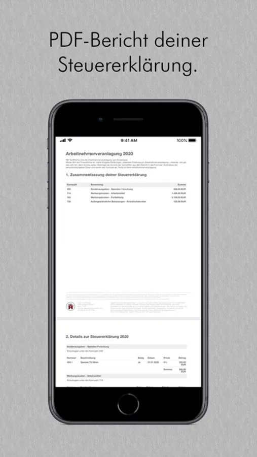 - Automatisch generierter, Bericht über alle gesammelten Belege: all deine Belege kannst du für das ausgewählte Jahr in einen PDF-Bericht umwandeln lassen, der bereits die Kennziffern für deinen Eintrag im Online-Portal der Finanzbehörde enthält.