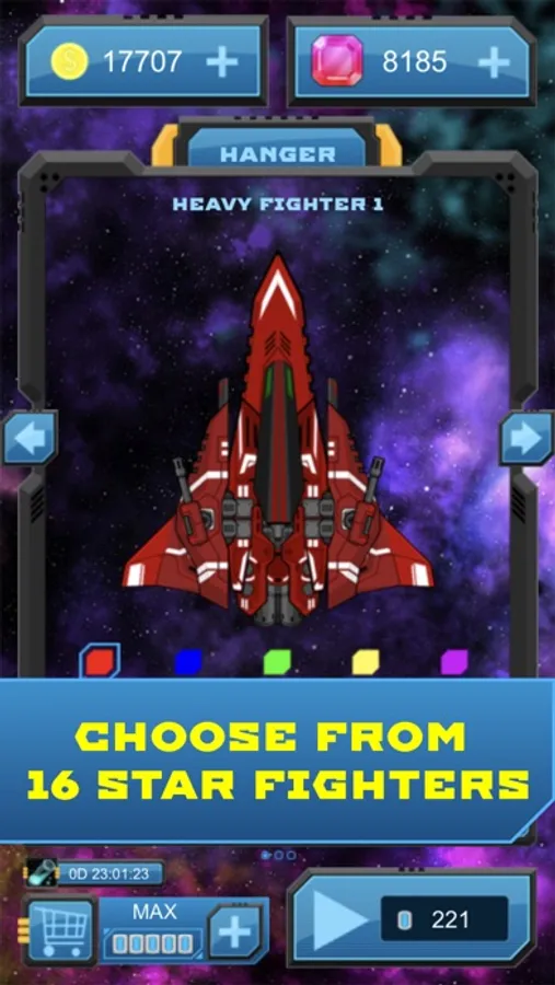 - Choose from 16 different star fighters of 7 distinct types: Light Fighters, Void Defenders, Ion Fighters, Destroyers, Plasma Fighters, Void Fighters and Heavy Fighters