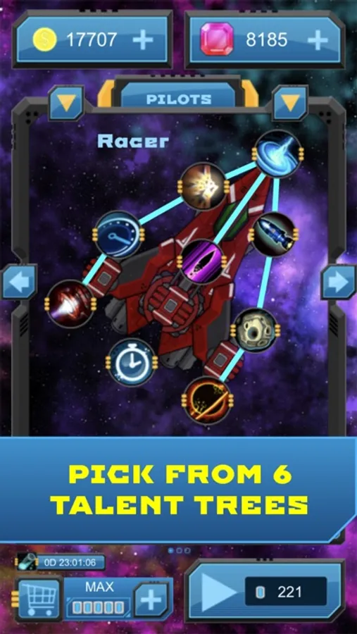 - Choose from 6 unique and different talent trees to enhance your pilots’ abilities as you level up - Racer, Sniper, Tactics, Guard, Wealth and Systems