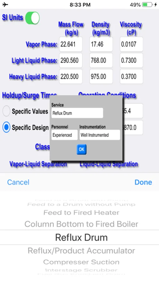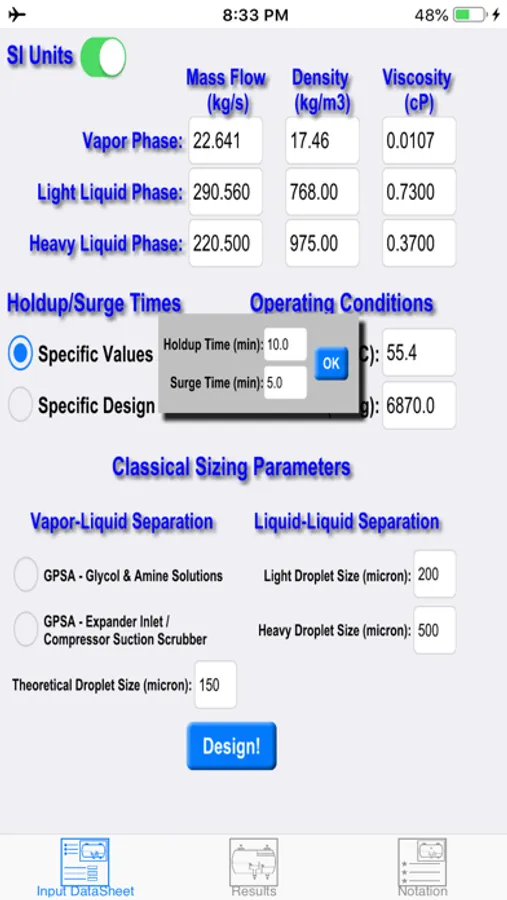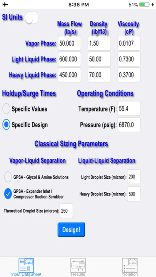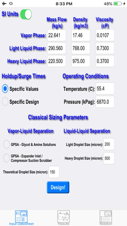 This app is the ultimate product of a PhD research project focused on the optimum design of oilfield separators. In this project, the most popular sizing approach of Svrcek-Monnery was modified to incorporate empirical phase separation data as well as the findings of Computational Fluid Dynamic (CFD) simulation of the process. Note, the popular classic methods are usually too conservative and specify oversized separators. The Realistic-CFD approach, on the other hand, proposes more economical separators that can successfully accomplish the separation task.