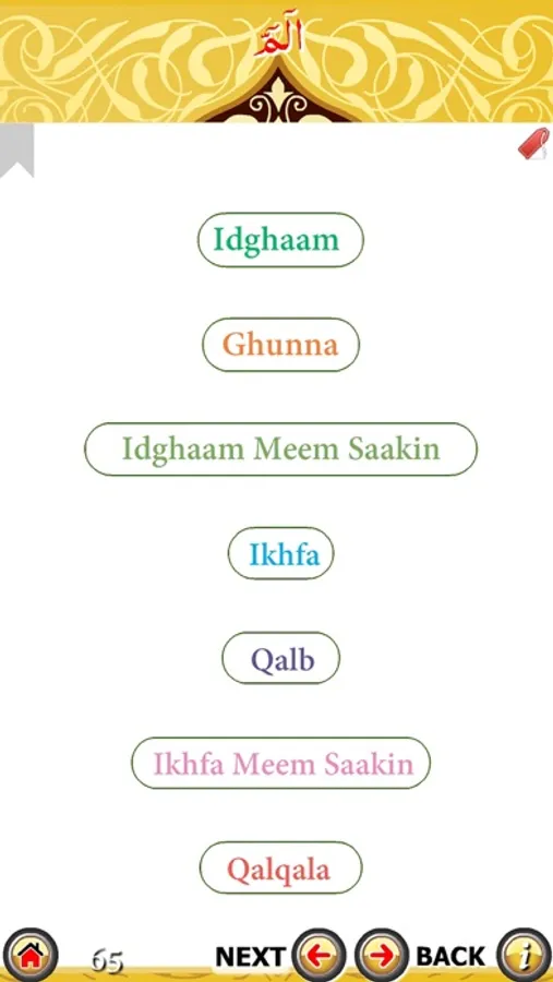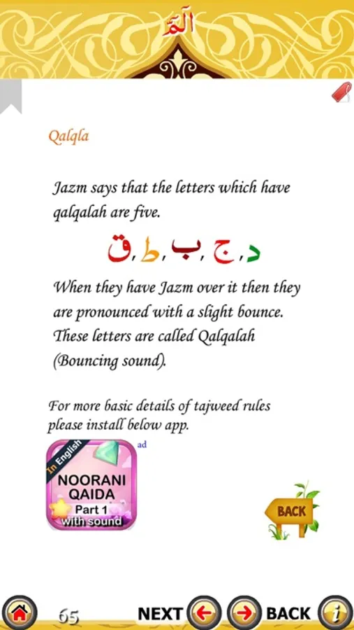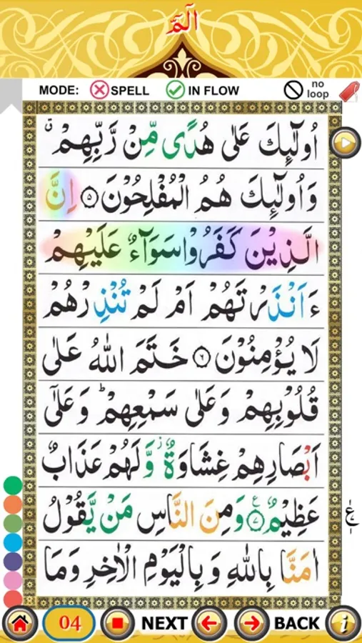 हिज्जे के साथ कुरान के पहले अध्याय (अलिफ़ लाम मीम पारा) ध्वनि के साथ प्रस्तुत किया गया है। इसमे मौलाना मुहम्मद सालेह की आवाज है। इसमे प्रत्येक शब्द के लिए ध्वनि है।