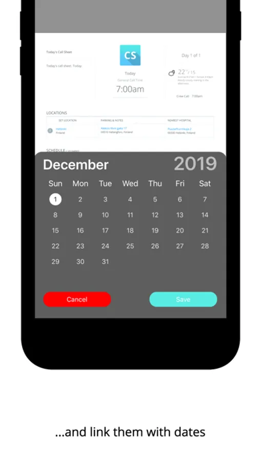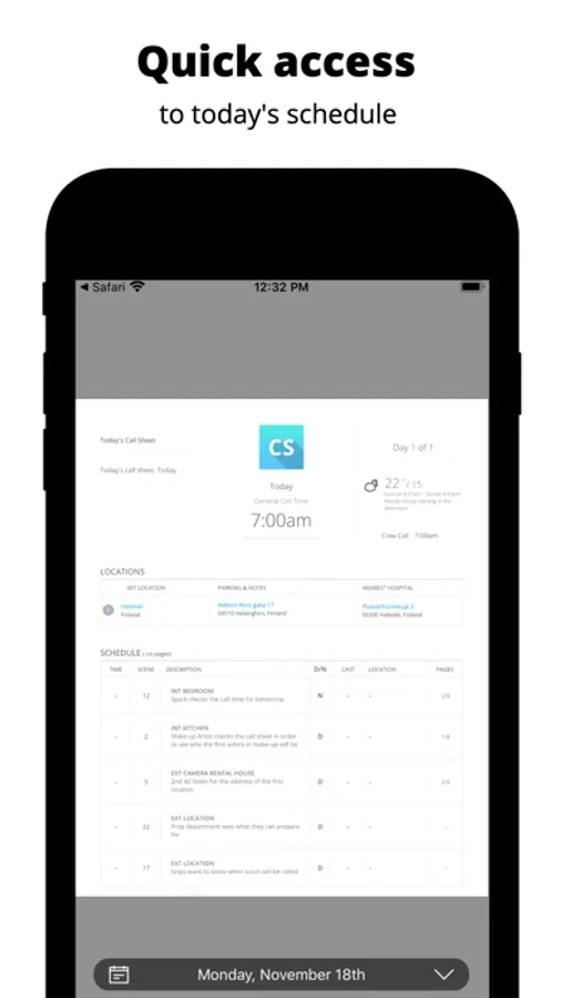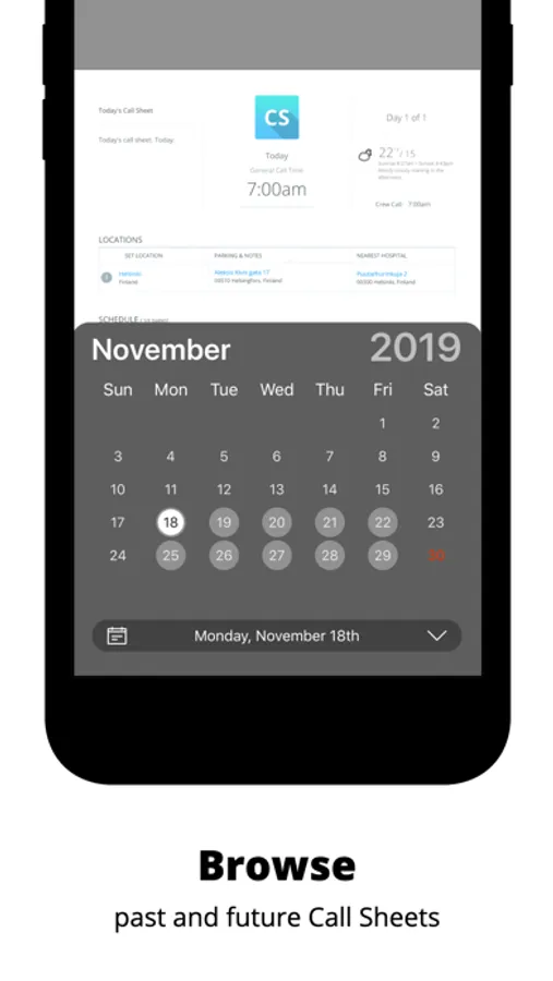 Today's Call Sheet lets you link call sheets from Mail or any other app to calendar dates. Opening the app from the home screen, it immediately displays the call sheet linked with Today. You can also browse all of your stored call sheets in a calendar view.