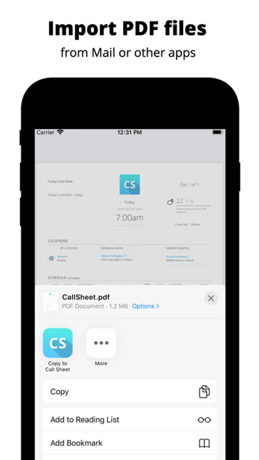 Open a PDF file from Mail or any other app such as Safari, and tap the Action Button (it's the square one with an upwards arrow in it), and find the option Copy to Call Sheet. Select the correct date for the call sheet and tap Save.
