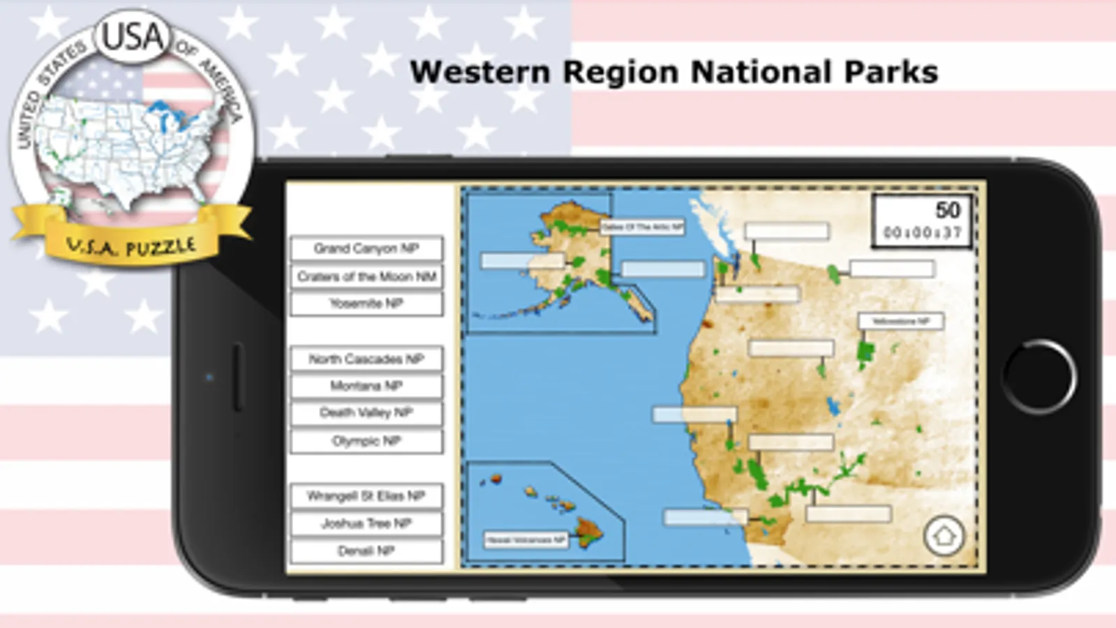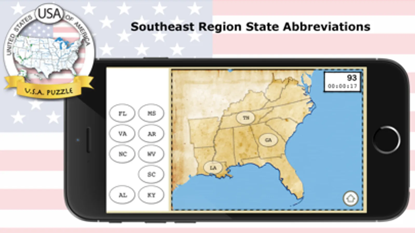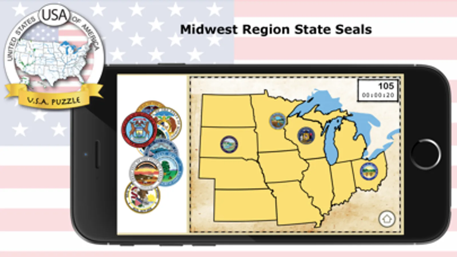 Just move the States, Seals and Abbreviations, Capital, River, Lake, Park and Mountain names to the correct location on the US and US Region Maps. Collect Points and Achievements, and challenge your friends on the Game Center.