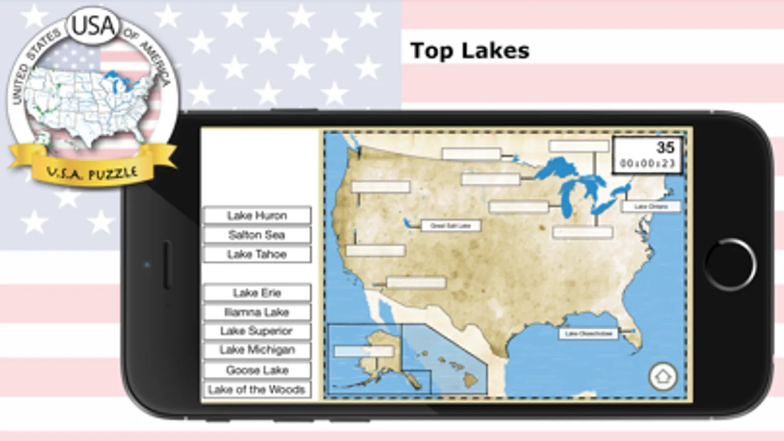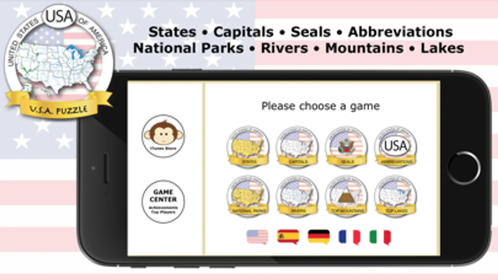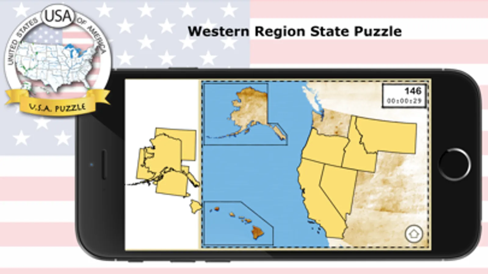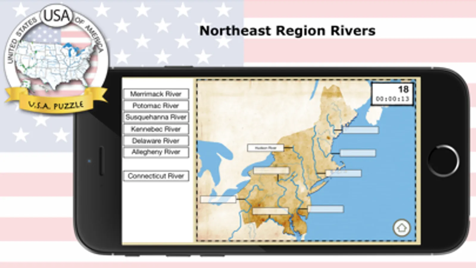 Just move the States, Seals and Abbreviations, Capital, River, Lake, Park and Mountain names to the correct location on the US and US Region Maps. Collect Points and Achievements, and challenge your friends on the Game Center.