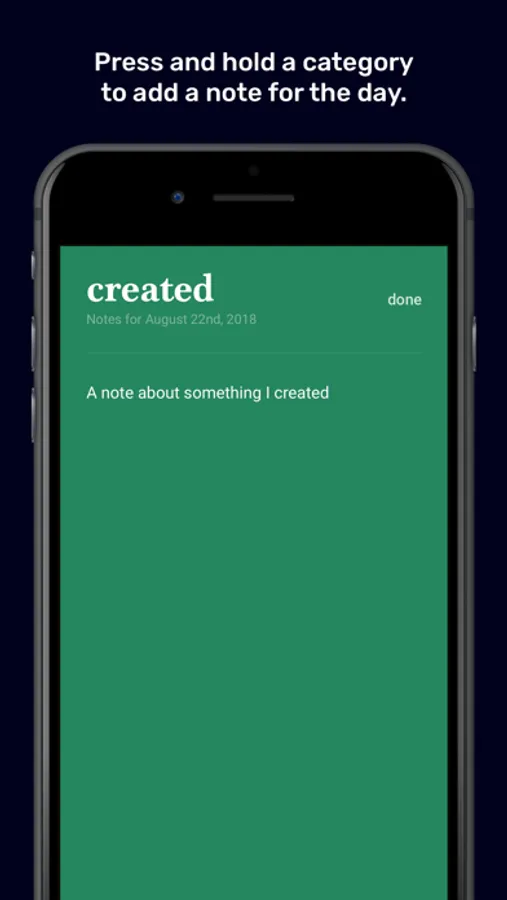No Zero days is a very simple app. It does almost nothing. You can mark an activity as complete for a day simply by tapping a category box. If you press and hold a box, you can add a note for that category for that day.