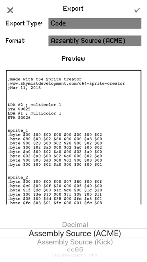 - Export as code formats Decimal, Assembly Source (ACME), Assembly Source (Kick), cc65, Spritepad 1.8.1, Spritepad 2.0, and Binary