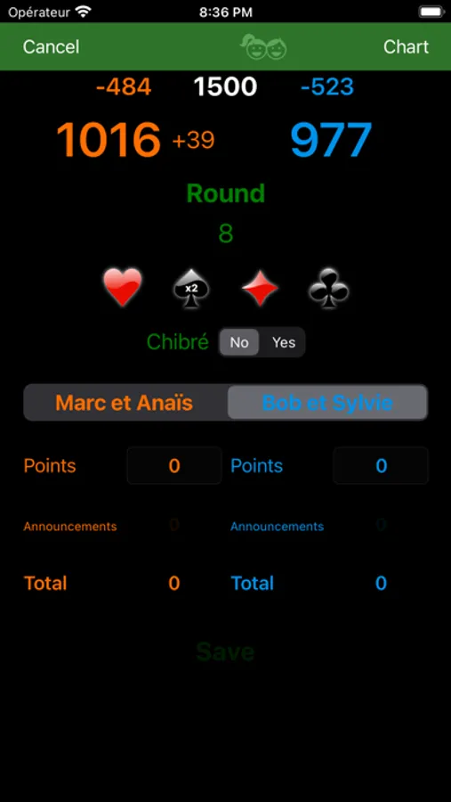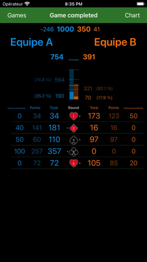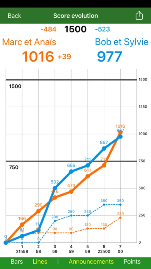 - Graph of a round's evolution in the form of bars or lines and display of points or announcements.