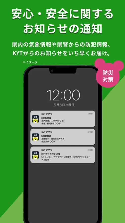 KYTからのお知らせやニュース速報のほか、お住まいの地域に気象警報、地震、津波、火山、避難情報、県警からの防犯情報などが発表された場合、プッシュ通知でいち早くお伝えします。