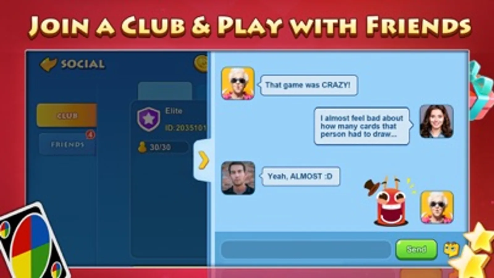 Connect with your buddies in UNO!™ with clubs and send each other gifts. Make a strategy and remember to shout UNO before anyone else.