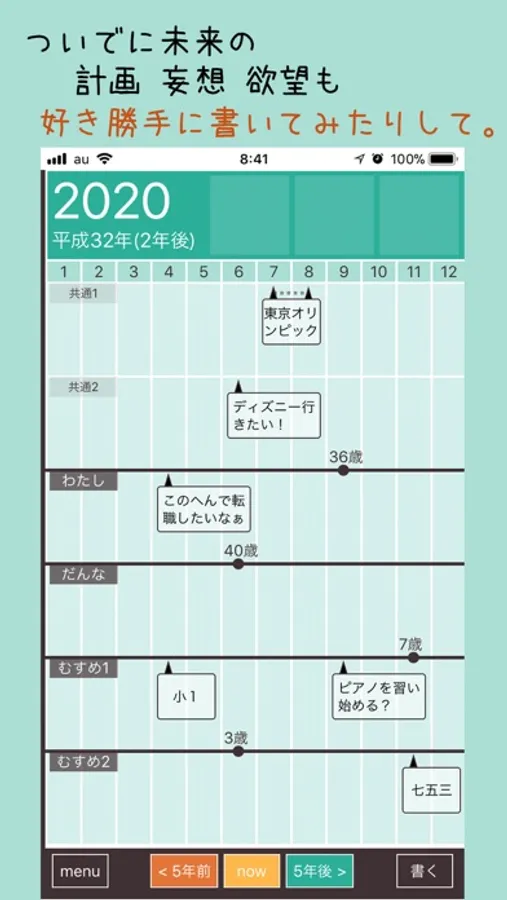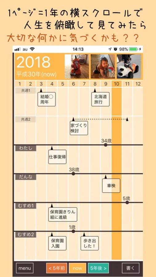 忘れっぽい子育てママが自分のために作った年表アプリ。めっちゃシンプル。簡単操作で楽しく書けます。日記は続かないけど、これぐらいザックリなら書けるかも!っていう方にも。まぁ、ひとまず使ってみてください。誰でもすぐに使いこなせると思います( ´∀`)