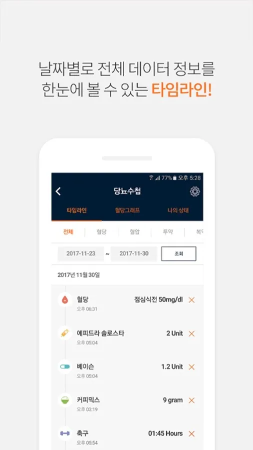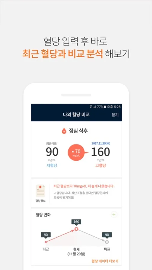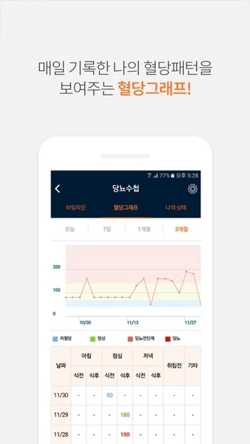 - 당뇨수첩 : 등록한 혈당, 혈압, 투약, 복약, 식사, 운동 기록등을 한눈에 볼 수 있는 타임라인을 제공하며 혈당 그래프를 통해 혈당 변화 추이를 간편하게 볼 수 있습니다. 또한 현재 나의 상태에 대해 다양한 코멘트를 보실 수 있습니다.