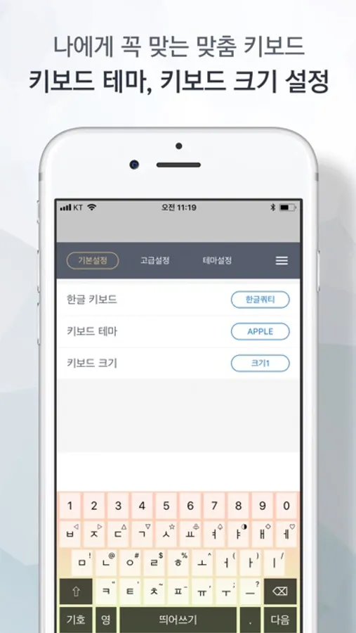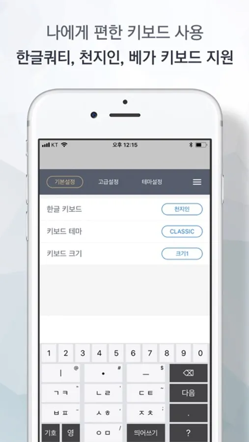 - 한글쿼티, 천지인, 베가 등의 한글 자판 선택.