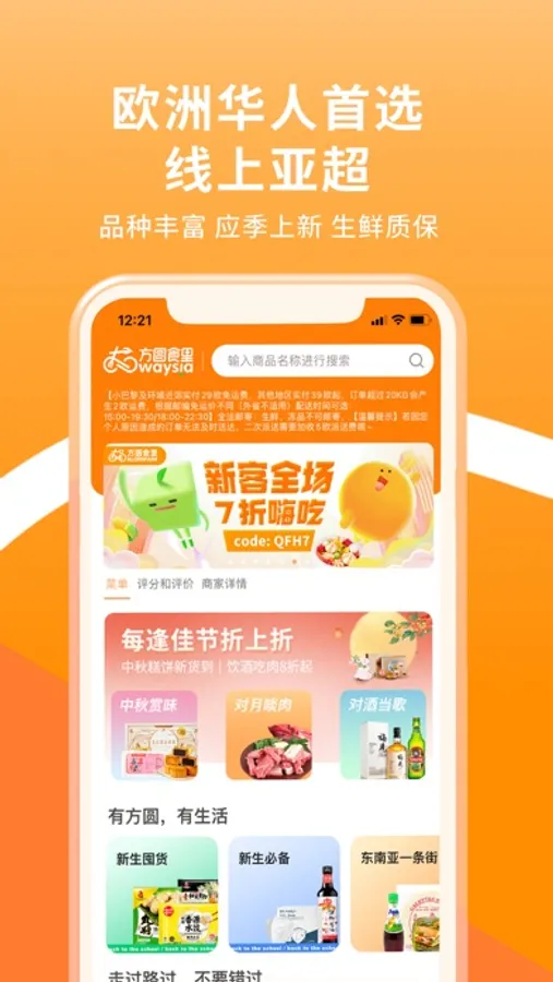 欧洲华人生鲜亚超和中餐外卖领先品牌——方圆食里Waysia (ex Alorsfaim),提供自营生鲜百货及精选餐馆外卖服务。以亚洲特色的生鲜、干货及餐厅为主打,为欧洲华人及亚洲美食爱好者提供丰富饮食的选择及便捷的生活方式。
